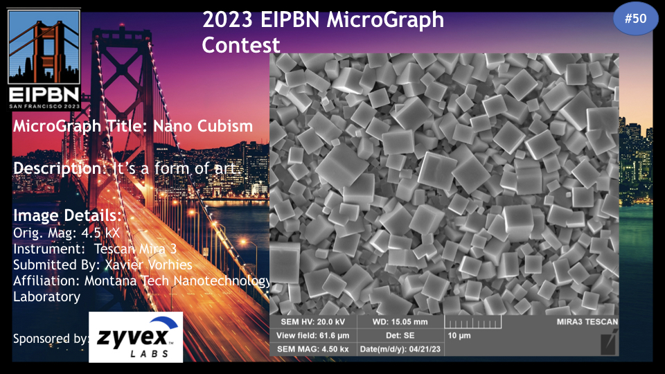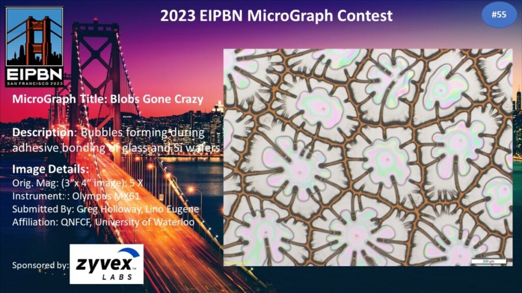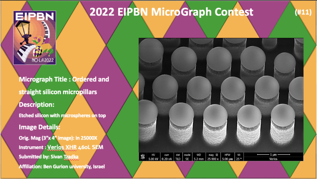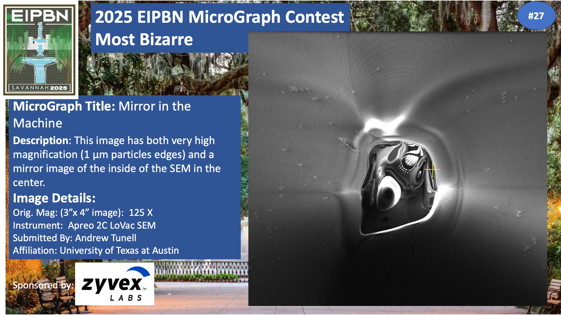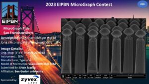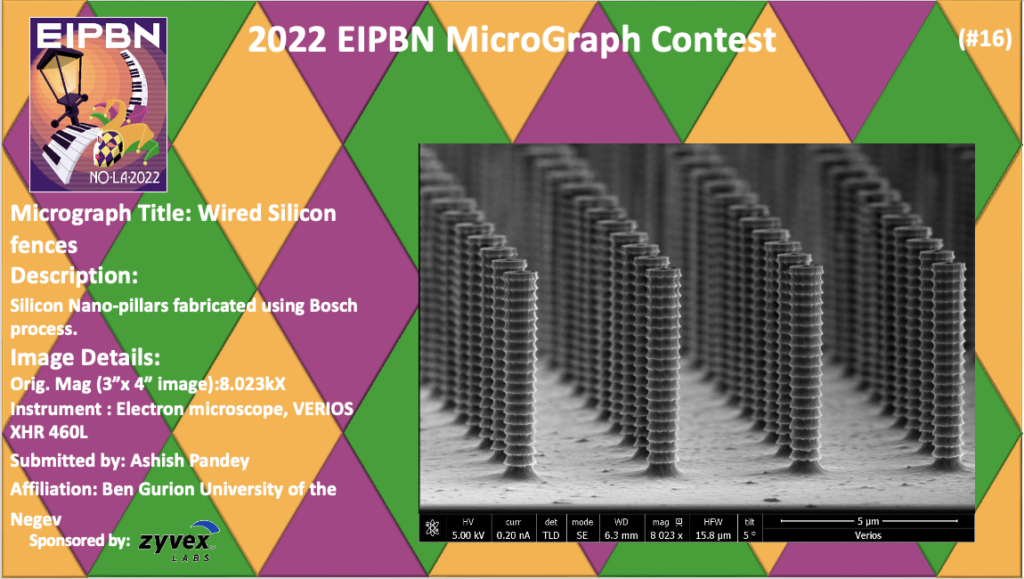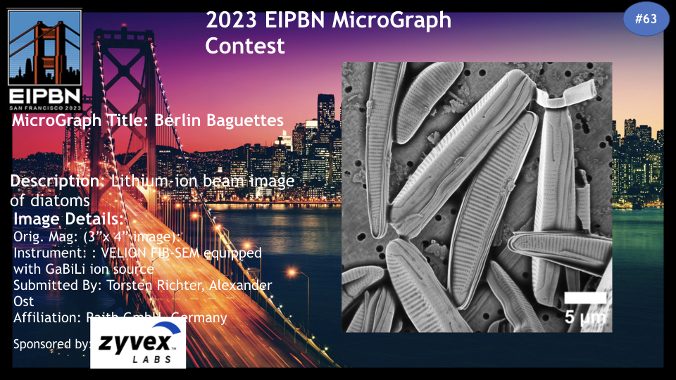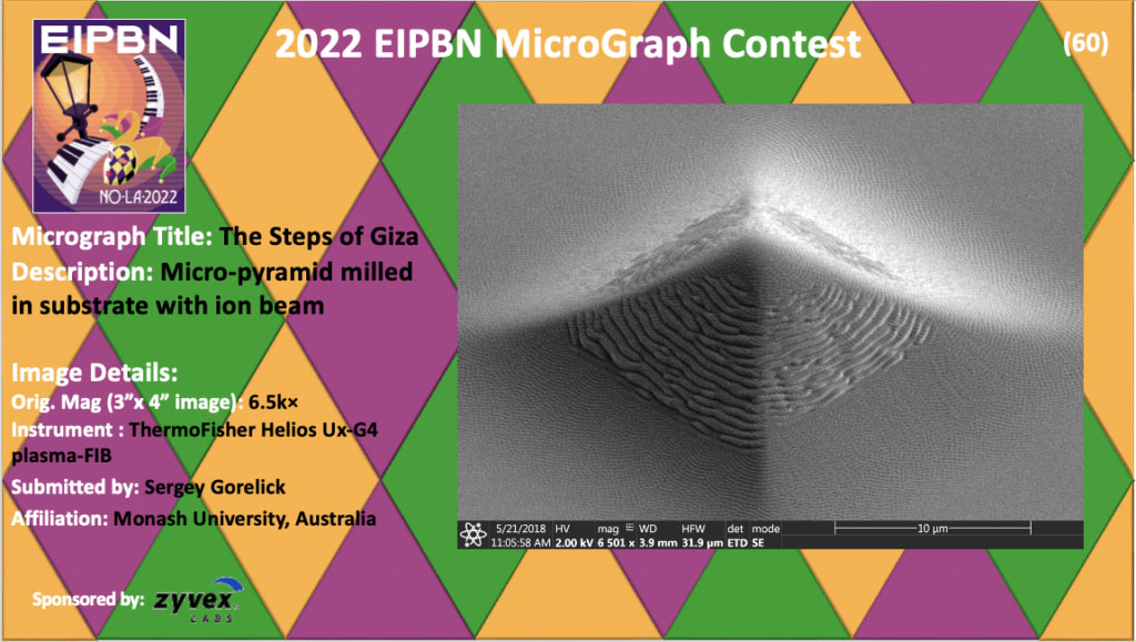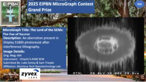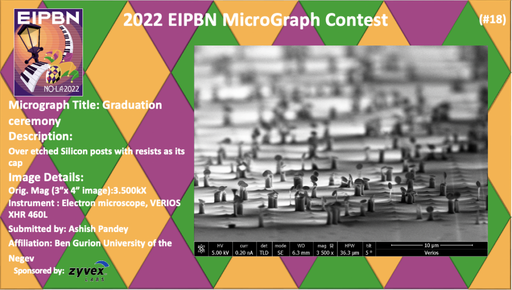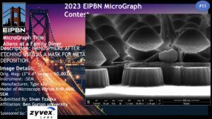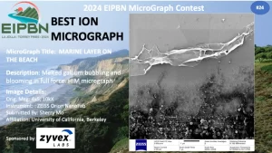 To highlight the importance of micrographs, EIPBN holds an annual micrograph contest. Submissions are sought from our community. Micrographs need not be related to research or to any paper or topic presented at the conference. Submissions may be purely for their beauty and ability to excite curiosity.