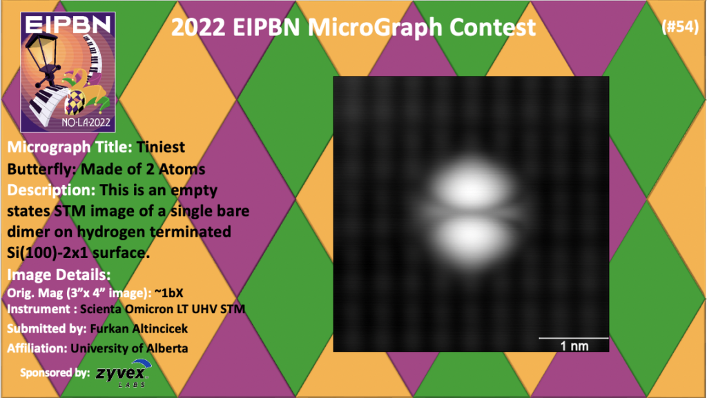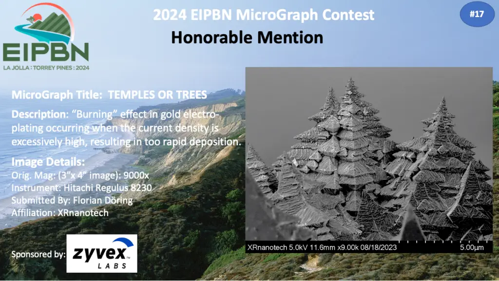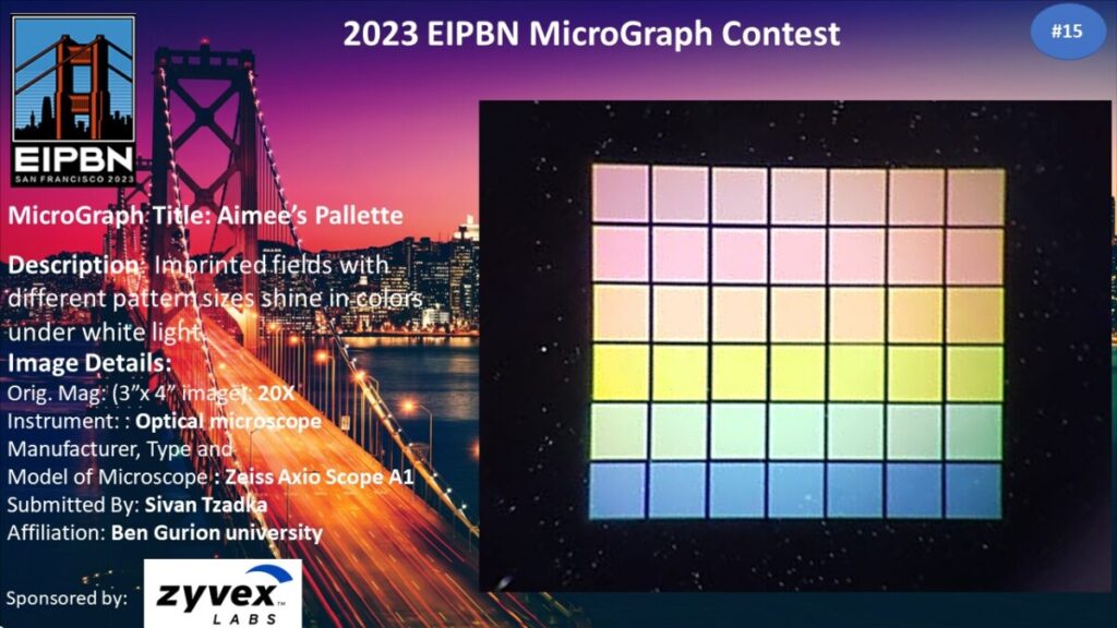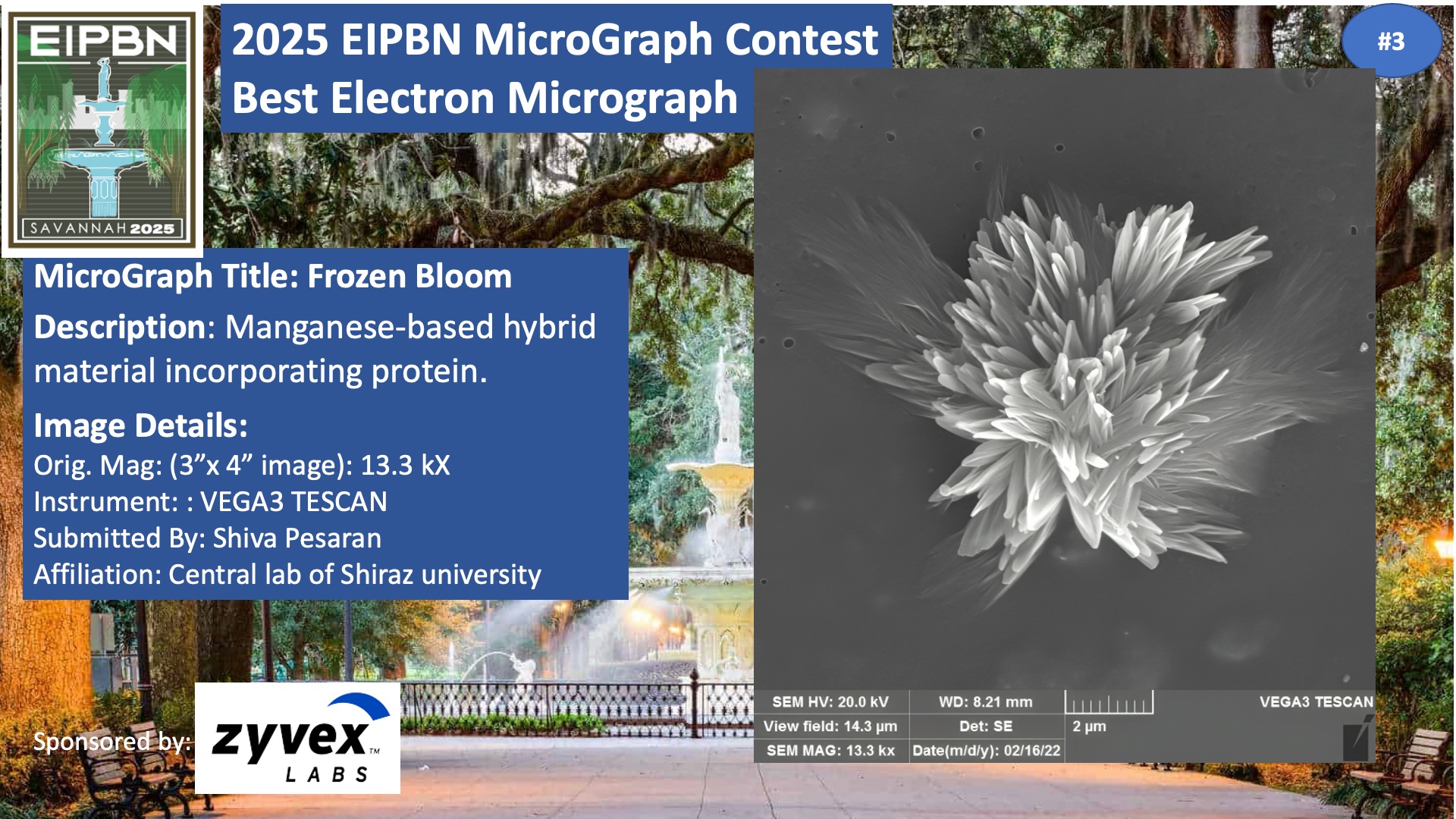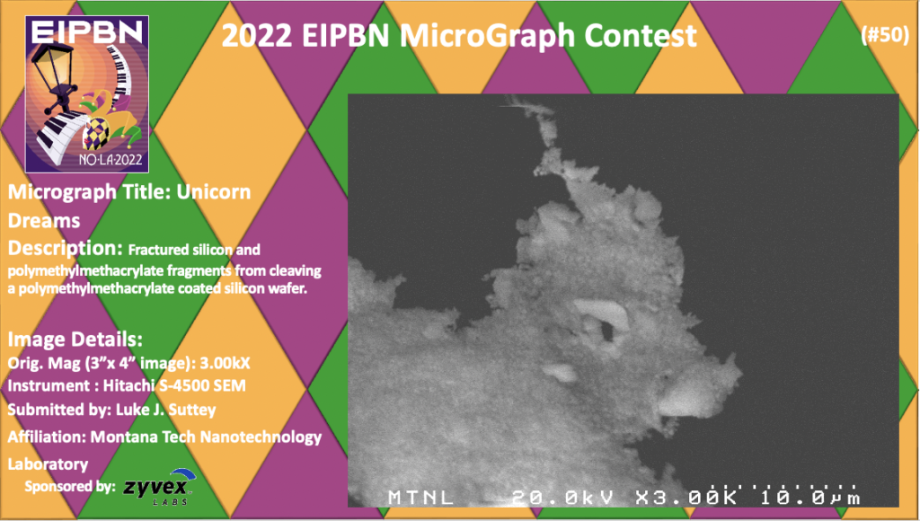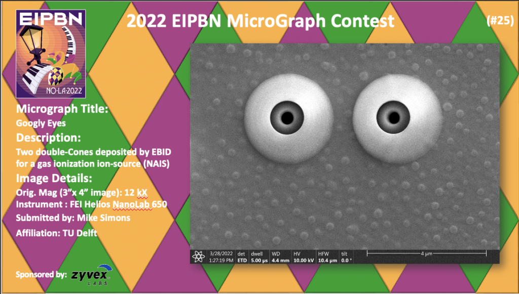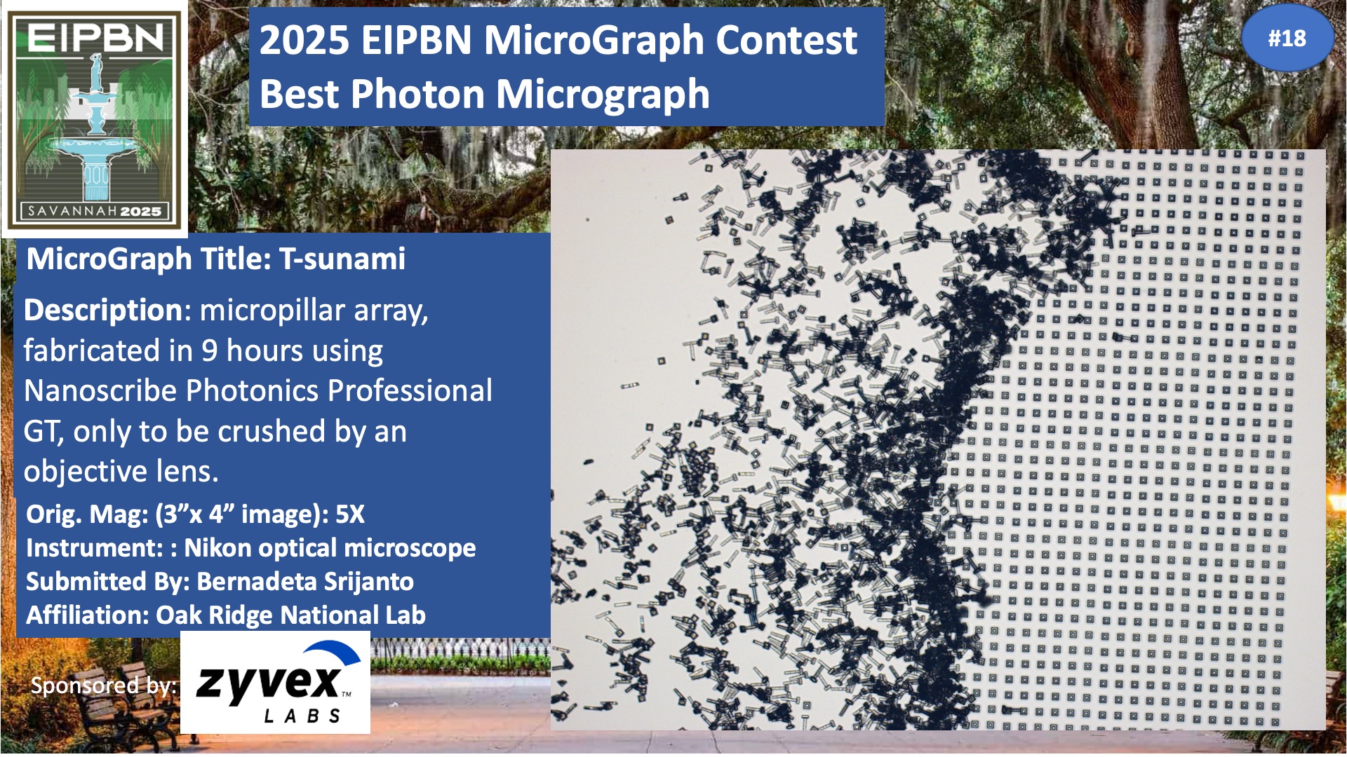 To highlight the importance of micrographs, EIPBN holds an annual micrograph contest. Submissions are sought from our community. Micrographs need not be related to research or to any paper or topic presented at the conference. Submissions may be purely for their beauty and ability to excite curiosity.