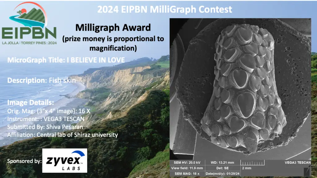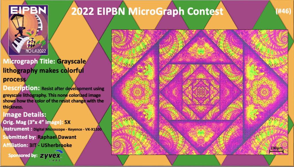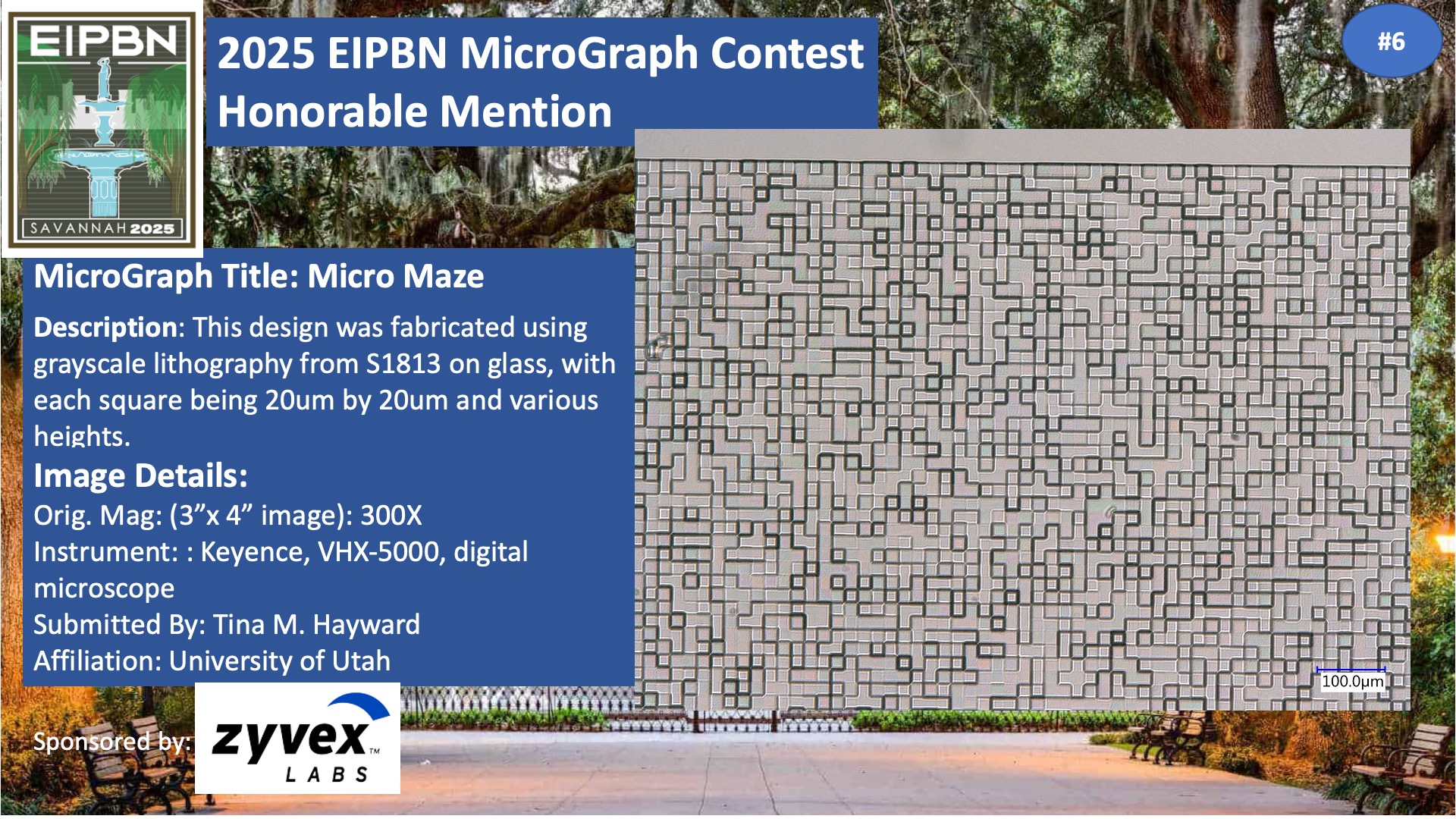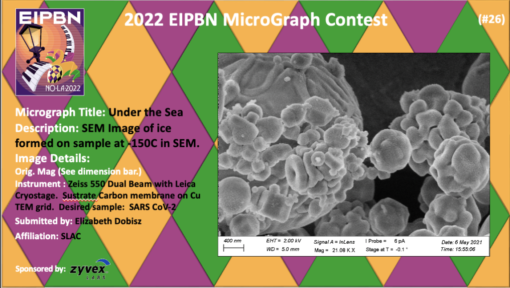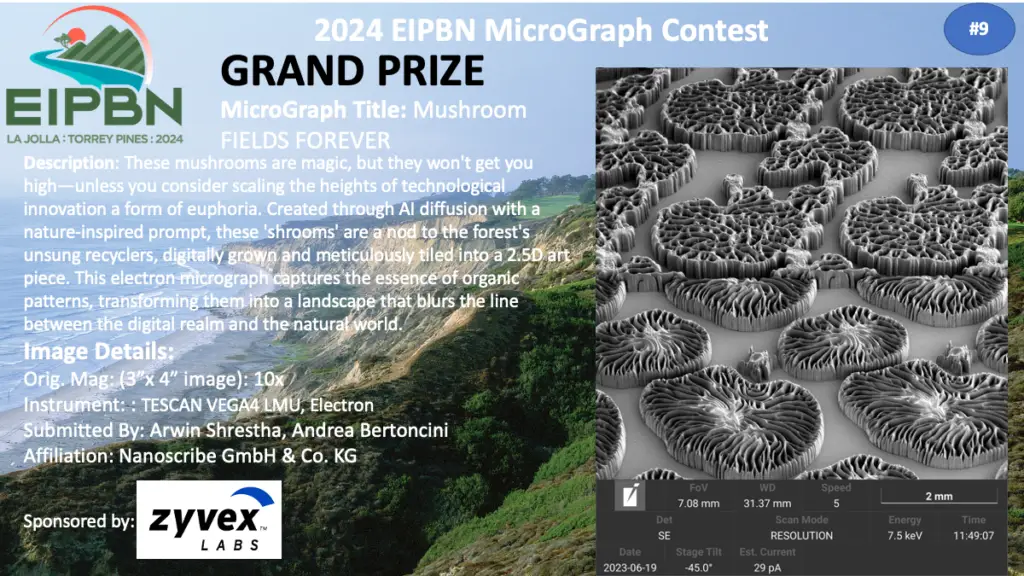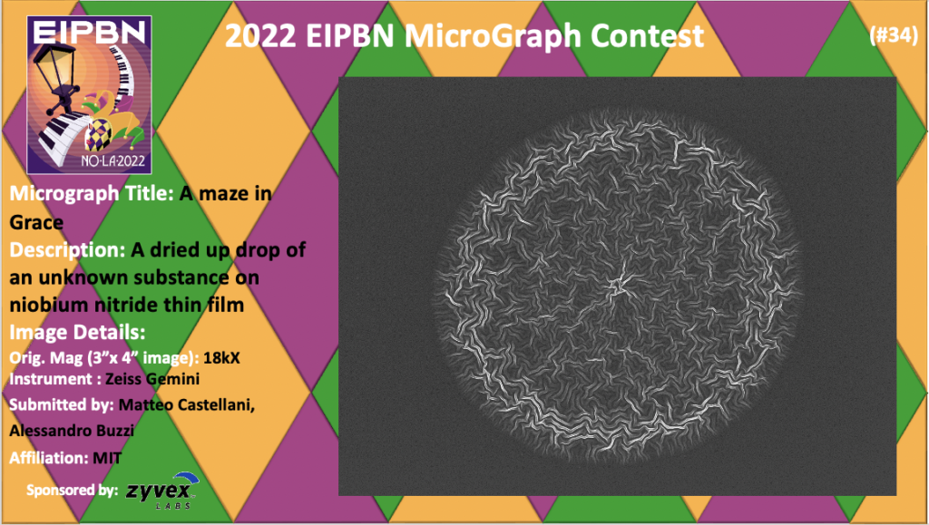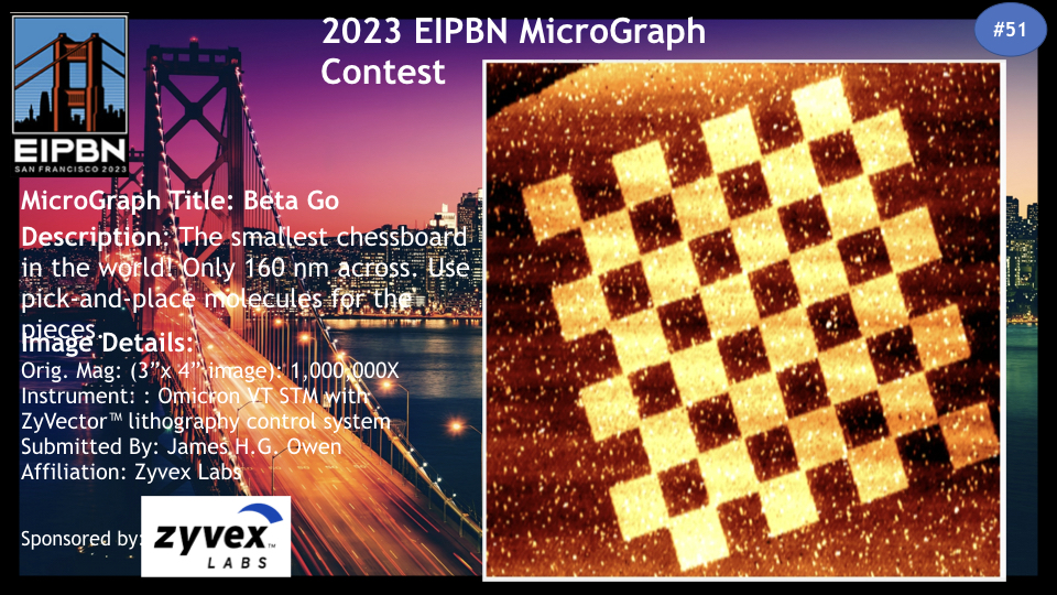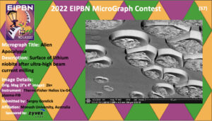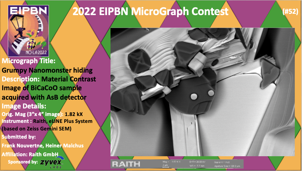 To highlight the importance of micrographs, EIPBN holds an annual micrograph contest. Submissions are sought from our community. Micrographs need not be related to research or to any paper or topic presented at the conference. Submissions may be purely for their beauty and ability to excite curiosity.